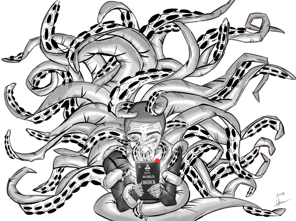 Es un primer dibujo en mi iPad Pro, en la aplicación Sketchbook, el título “el nuevo orden mundial”